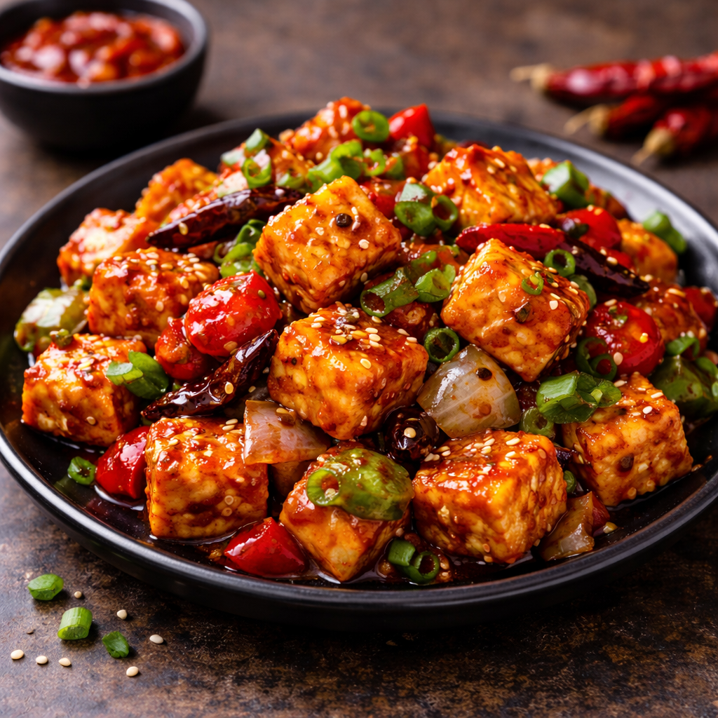 Dry Chilli Paneer features crispy paneer cubes tossed with onions, capsicum, and dried red chillies in a spicy, glossy Indo-Chinese sauce, delivering bold heat, rich flavor, and irresistible aroma in every bite. ????️????