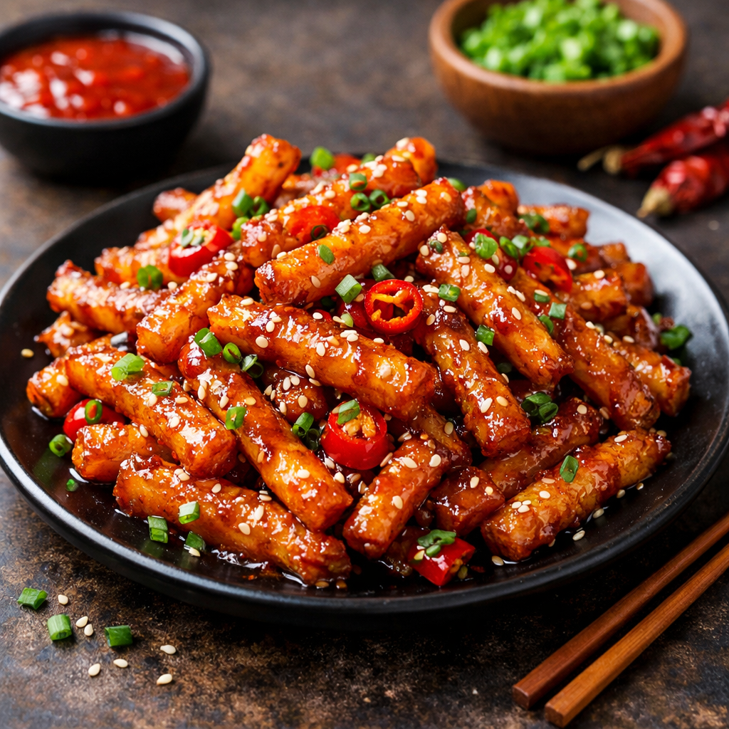 Honey chilli potato is a popular Indo-Chinese appetizer made with crispy fried potato fingers tossed in a glossy honey chilli sauce. It perfectly balances sweet and spicy flavors, garnished with sesame seeds, spring onions, and red chilli, making it a crunchy, flavorful, and irresistible snack served hot.